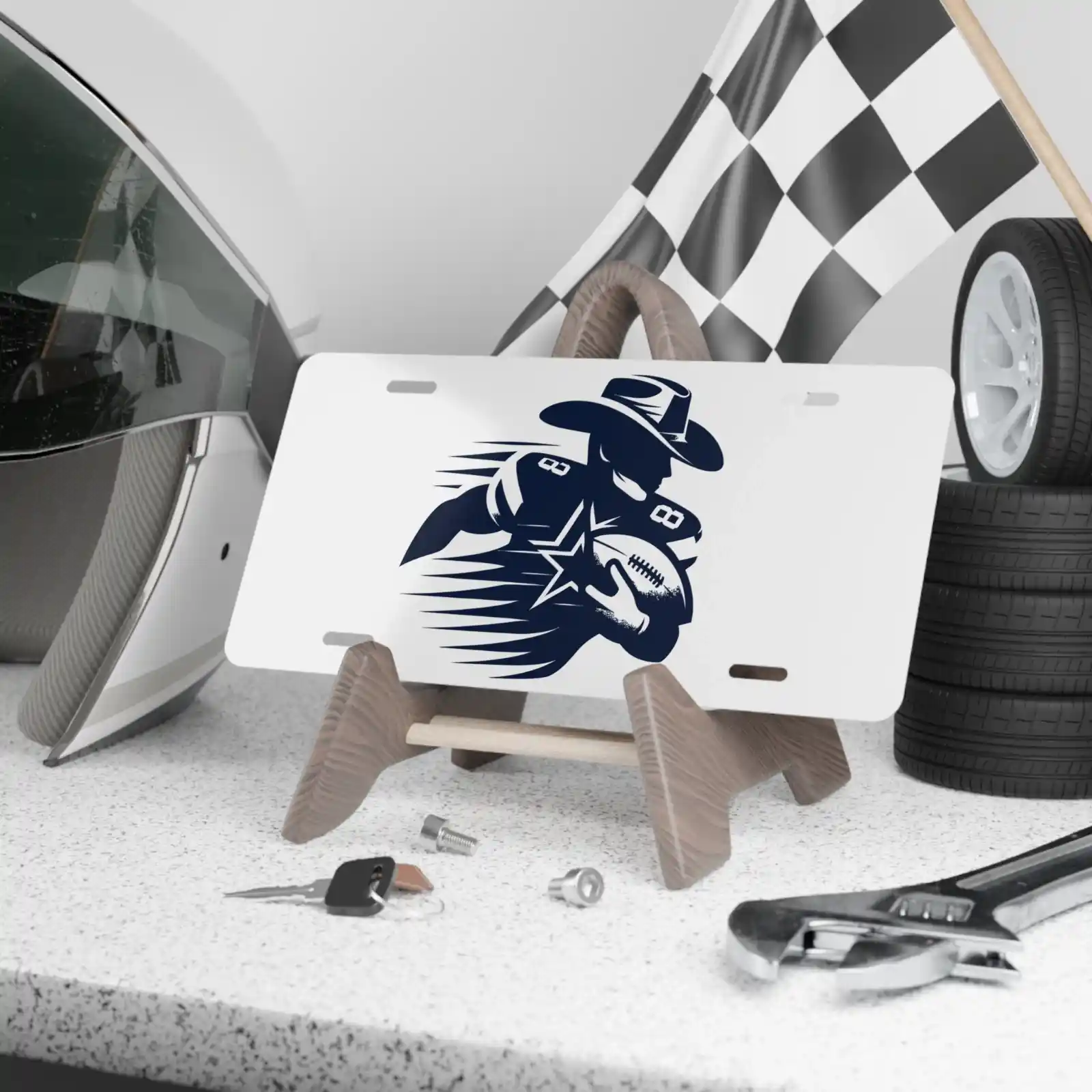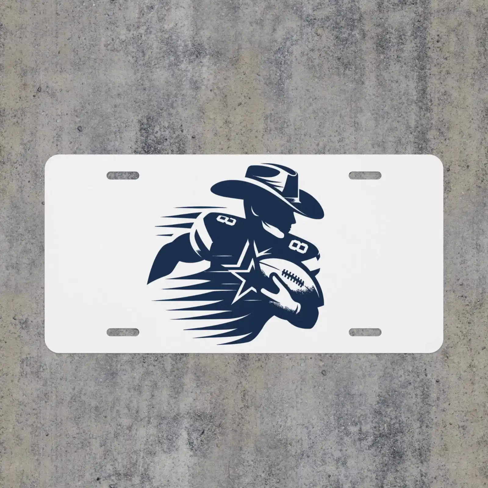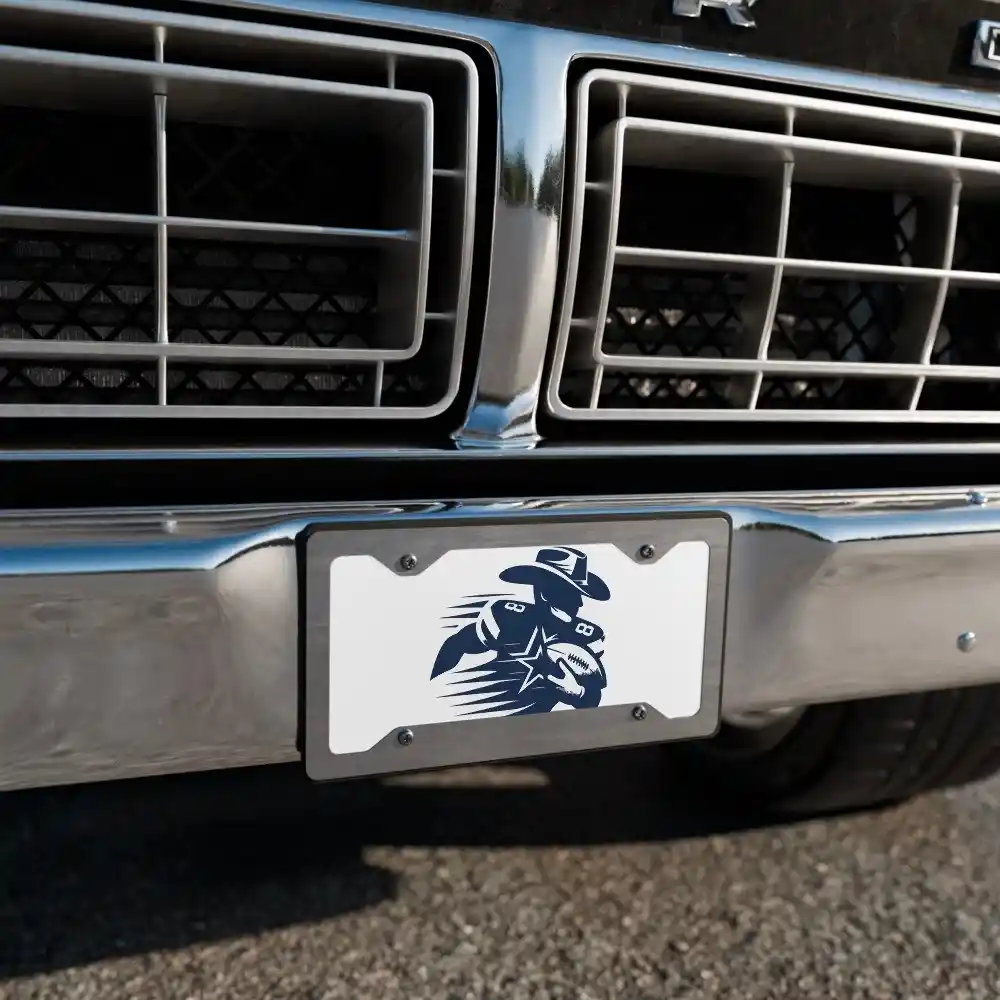 Turn heads wherever you drive with this bold Cowboy football player front license plate. Featuring a striking navy silhouette of a running back in a cowboy hat and jersey number 88, this 6″x12″ aluminum plate captures the spirit of Texas football. As a result, your car, truck, or SUV becomes an unmistakable symbol of Dallas pride and Lone Star energy.