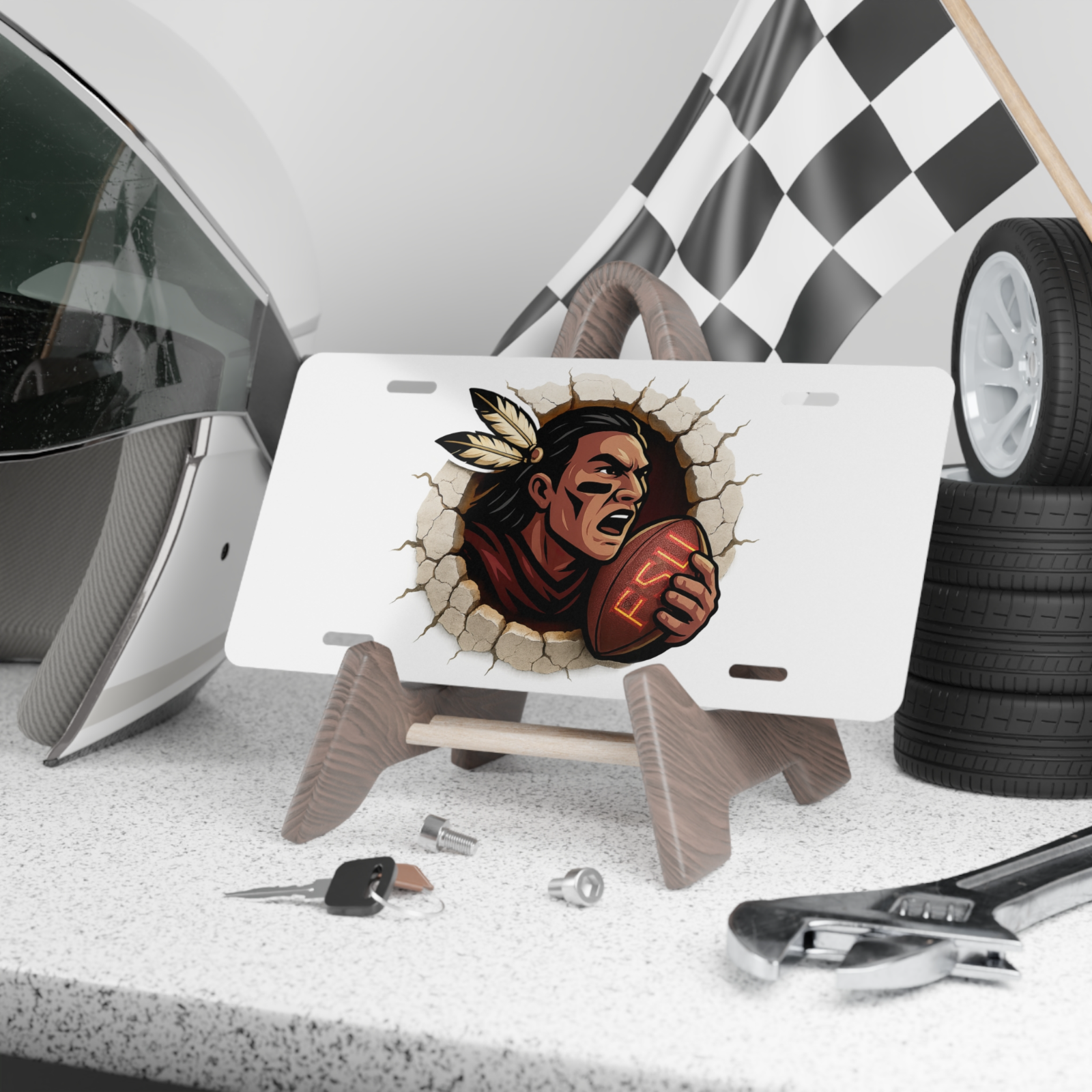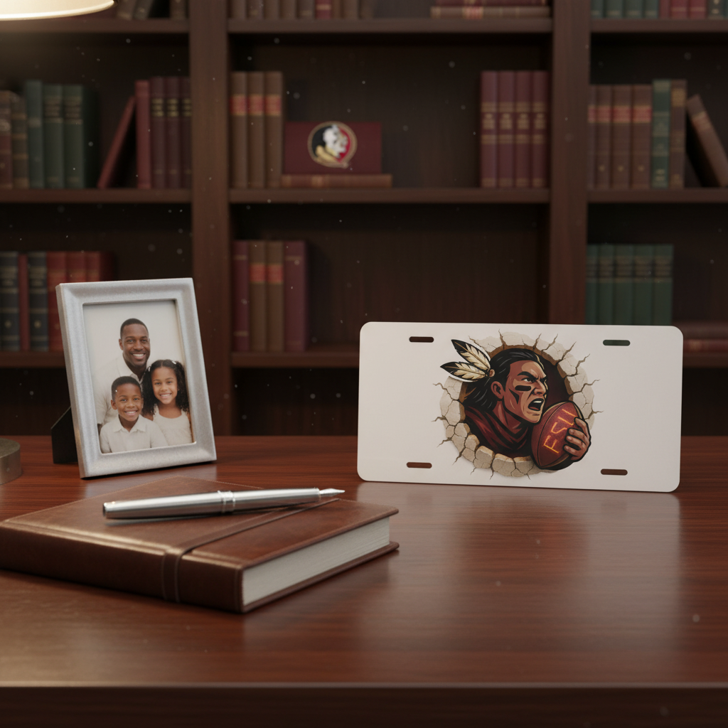 Show off your Seminole spirit with this bold aluminum license plate featuring the fierce FSU mascot bursting through with a football. Perfect for Florida State students, alumni, and loyal fans, this 6×12 plate is a must-have for cars, trucks, or fan décor.