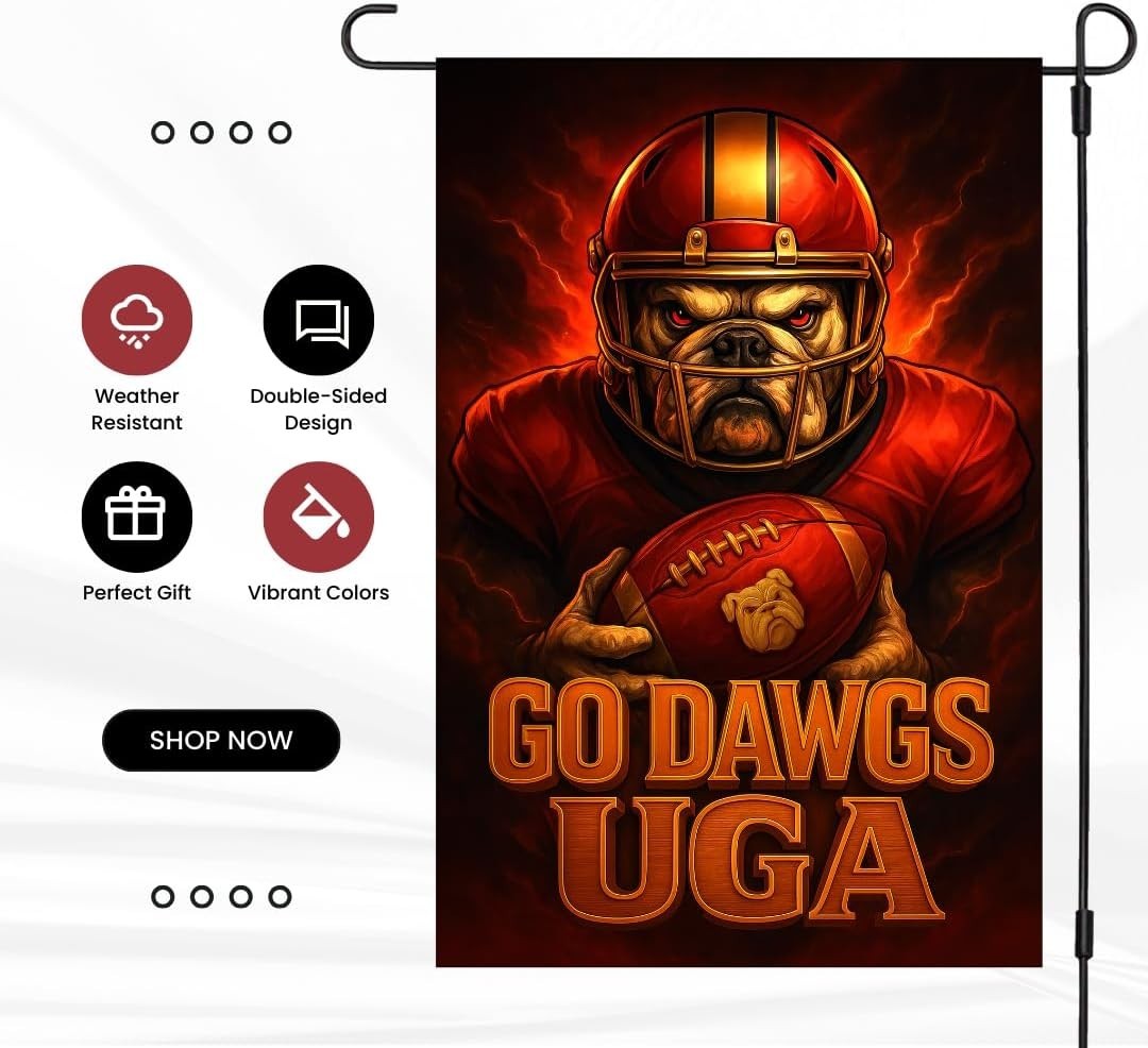 Show off your Bulldogs pride with this powerful 12″x18″ double-sided garden flag. It features a fierce football-playing bulldog mascot with the bold “GO DAWGS – UGA” slogan. Whether you’re tailgating before a game or decorating your lawn, this flag delivers ultimate team spirit.
