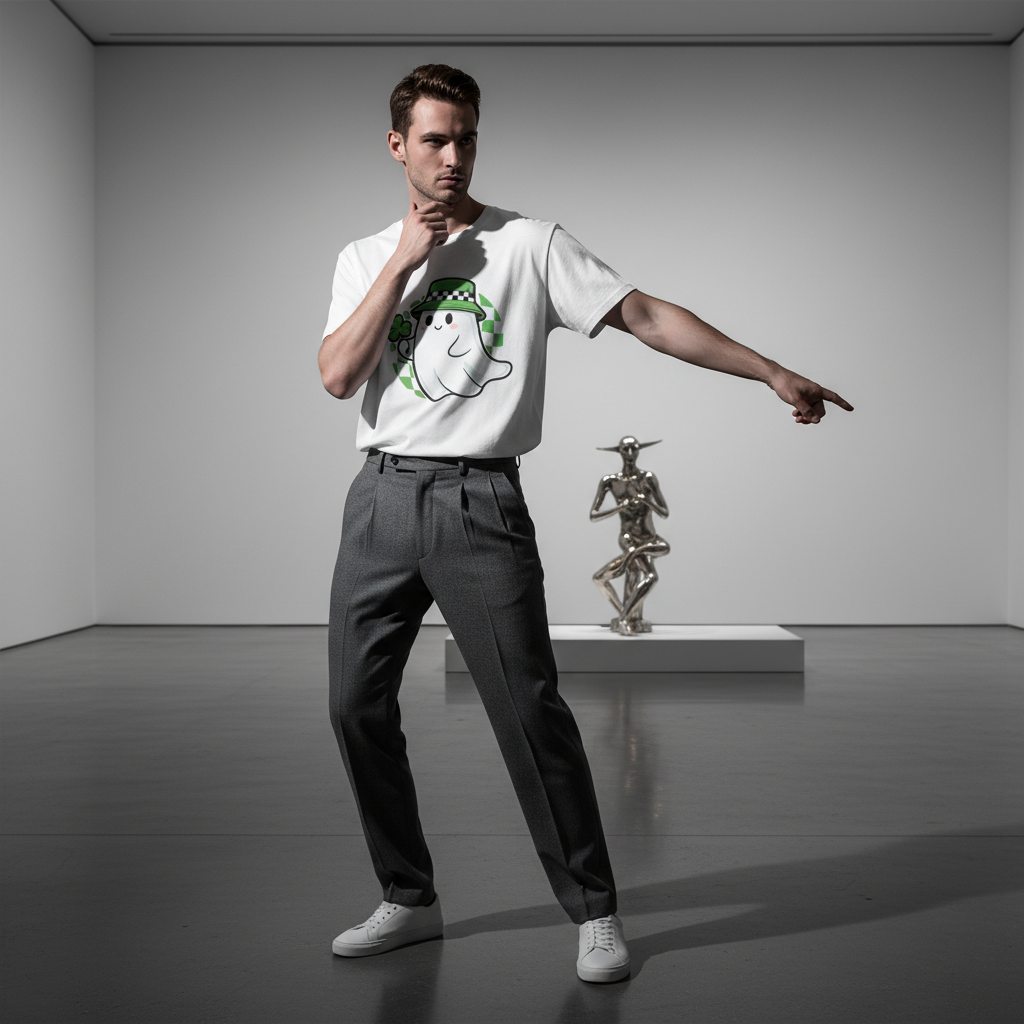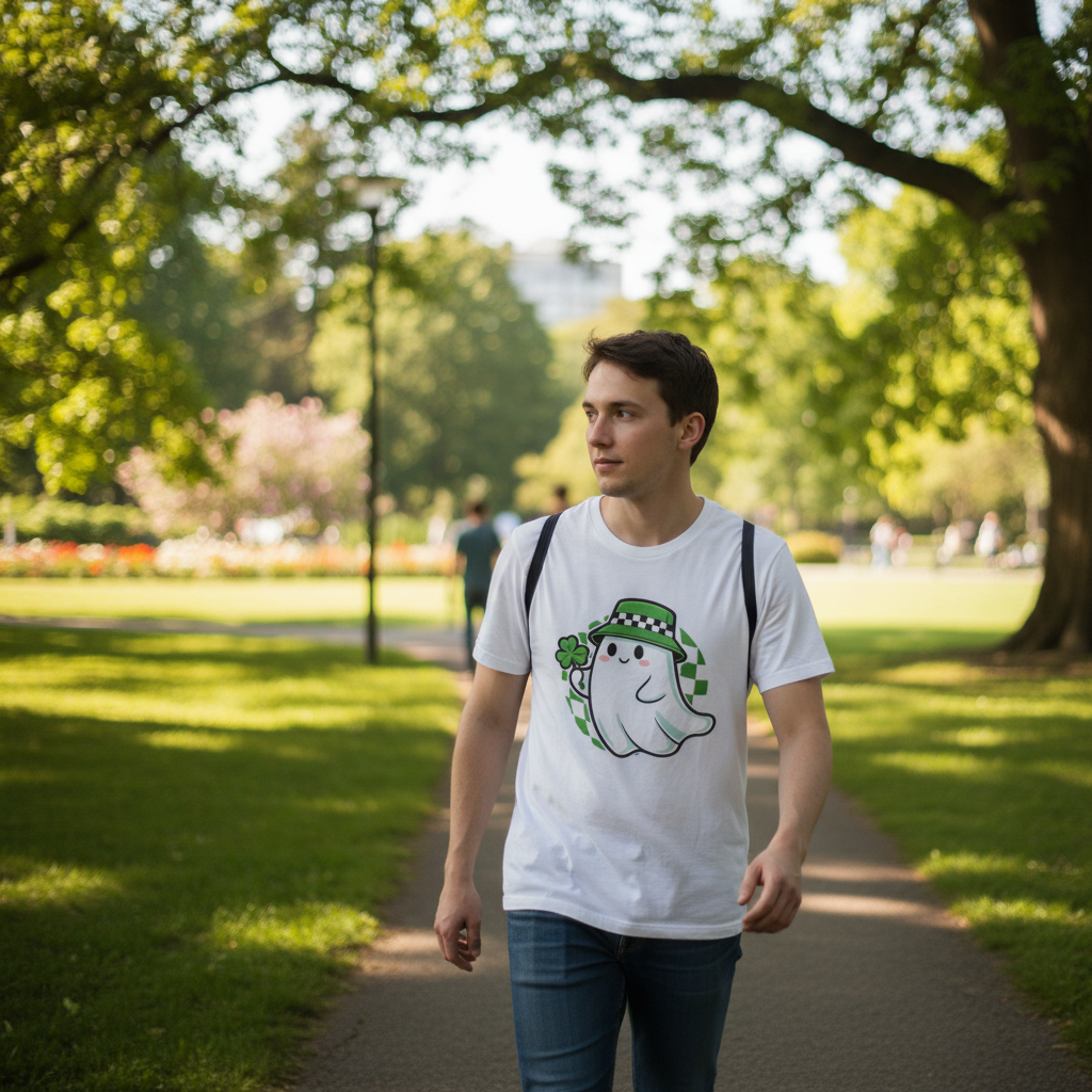 Get ready to celebrate in style with this irresistibly cute lucky ghost graphic t-shirt. Perfect for St. Patrick's day festivities or everyday kawaii wear, this charming tee features an adorable smiling ghost sporting a trendy green checkered bucket hat and holding a lucky four-leaf clover. Set against a playful green checkerboard circle, the vibrant print pops beautifully against the classic white background. Crafted from premium 100% cotton, this standard fit crew neck shirt offers superior breathability and all-day comfort. Whether you are hunting for the perfect lucky charm or just looking to upgrade your casual wardrobe with a touch of whimsical style, this high-quality graphic tee is a must-have addition to your collection.